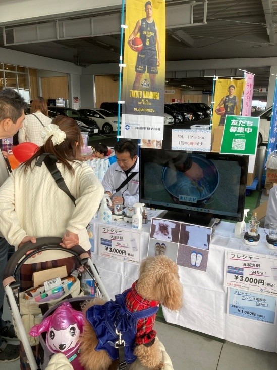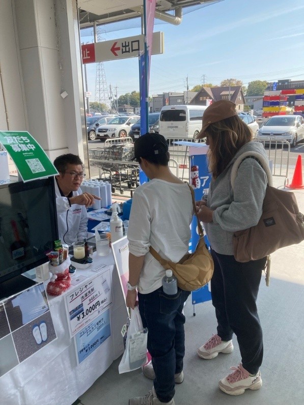 洗濯洗剤の実演では『口紅やラー油のシミ汚れ』が剥がれていくときに大変盛り上がっていただけました。また、ラジオCMを聴いて購入していただいたお客様や以前サンプルを使用して購入していただいたお客様など少しずつではありますがフレシャーの認知度が上がってきたように感じました。